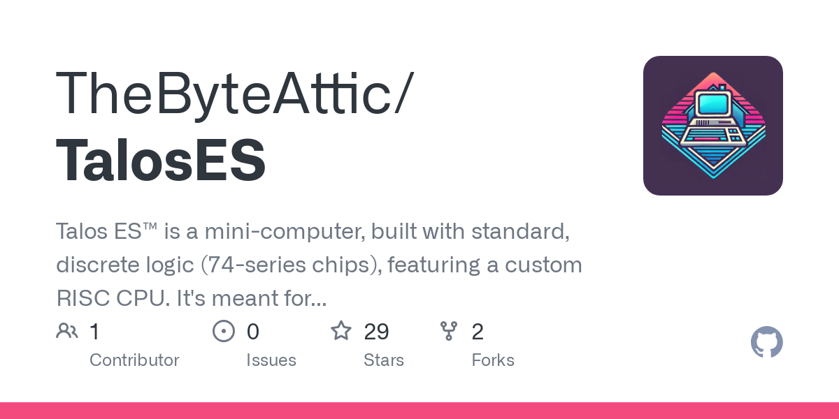 GitHub - TheByteAttic/TalosES: Talos ES™ is a mini-computer, built with standard, discrete logic (74-series chips), featuring a custom RISC CPU. It's meant for education and entertainment.Talos ES™ is a mini-computer, built with standard, discrete logic (74-series chips), featuring a custom RISC CPU. It's meant for education and entertainment. -…github.com
